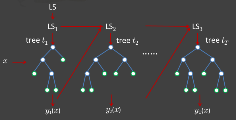 [Figure.3] Boosting of tree construction. Successive trees would get weighted to points which were incorrectly predicted. In the end prediction would be accomplished by taking a vote with weighted.