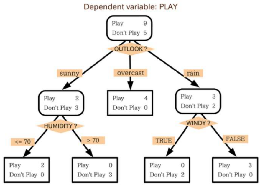 [Figure.1] A simple example demonstrates decision trees. There is a variable with conditions to classify two dimension data, people who want to play and not to play ball games.