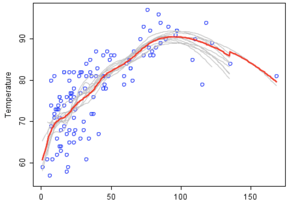 [Figure.2] The basic concept implements random forest method. The blue point represents each observed data. Each gray curve, a weaker learner, is an approximation to one subset of total data. The red curve, a stronger learner, is much better and outstanding than the other gray curve.
