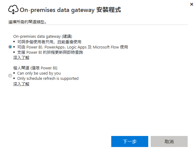 - 「個人閘道」與「內部部署資料閘道」的差異如下,可參考官網說明 link。