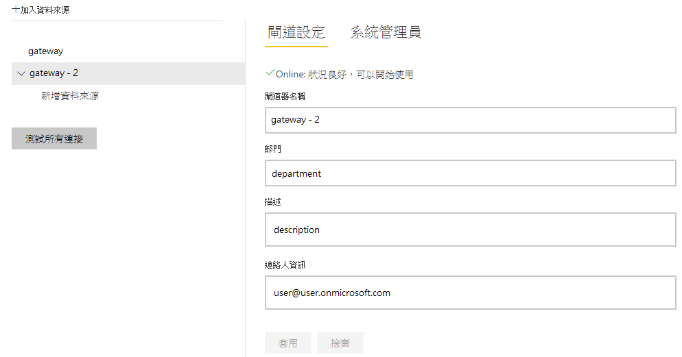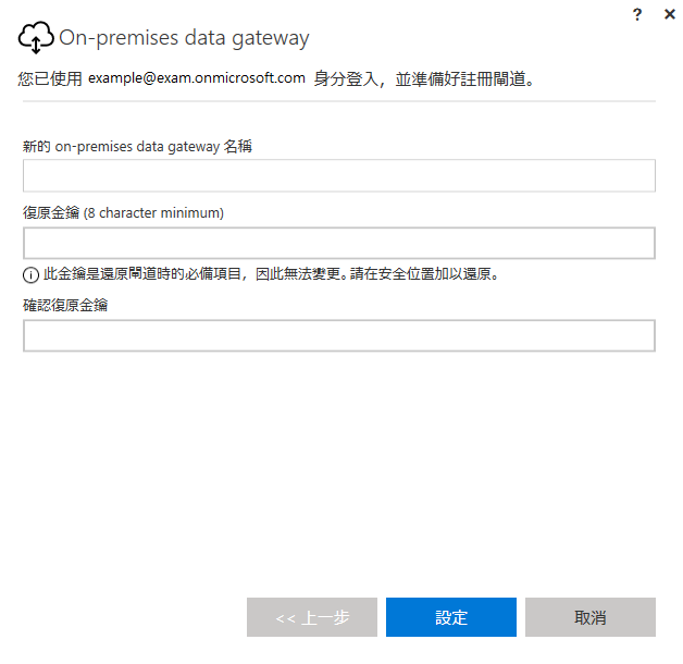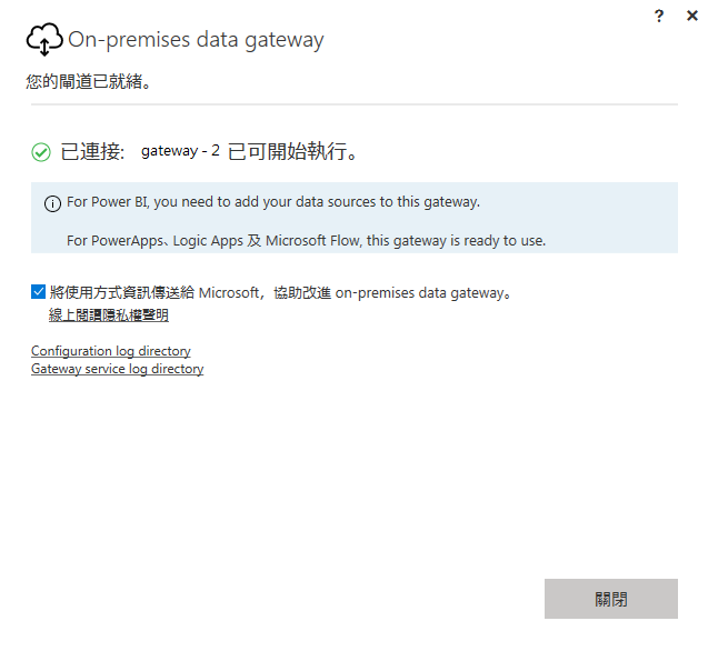 - on-premises data gateway : 為之後準備使用的閘道器名稱
