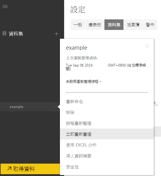 - 發布完成後,便可以透過資料集管裡的「立即重新整理」或「排程整裡來達成」