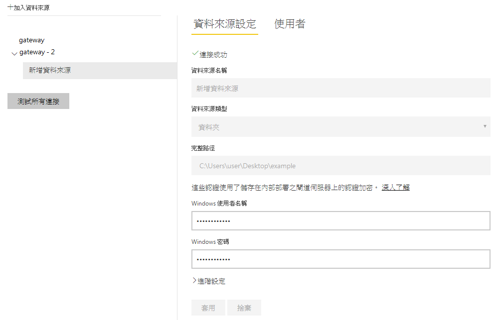 - 加入「新增資料來源」,並將要同步的資料夾 (底下資料作為 Power BI Desktop 資料來源位置) 等資訊填入